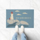 Esta porta personalizada é perfeita para a sua cabana ou outra casa de praia. Ele tem uma simples ilustração náutica de um farol em vermelho e creme ou marfim. O farol fica em uma costa rochosa com ondas caindo abaixo e nuvens negras no céu. O gráfico é colocado sobre um fundo azul francês macio.