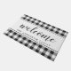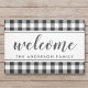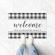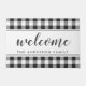 Tapete de boas-vindas personalizado em estilo de fazenda com o nome da família em padrão festivo preto e branco xadrez/ ginga/ xadrez búfalo.