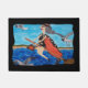 Esta é uma pintura folclórica original de uma bruxa engraçada voando sobre sua vassoura sobre o oceano no caminho para suas férias na praia. Ela tem um maiô preto com uma capa com estrelas e seu gato preto está pendurado na vassoura por uma vida querida. Ela está voando sobre o mar na praia com as gaivotas. Veja minha loja Art by MAR para outros produtos com esta design.