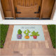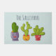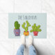 Uma porta personalizada com uma ilustração esbranquiçada apresentando 3 pequenos cactos felizes sentados em seus próprios potes de flores. Cada um deles tem suas próprias expressões únicas sorrindo e parecendo feliz.