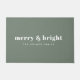 Um tapete de porta de boas-vindas de feriado moderno, na moda, com uma ousada tipografia retrô, que diz "feliz e brilhante" em branco, numa cor verde de floresta de sábio escuro. A saudação e o nome podem ser facilmente personalizados para um toque pessoal. Uma design moderna, minimalista e contemporânea para se destacar nesta temporada de férias!
