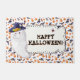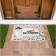 Tapete de Halloween festivo com um fantasma sorridente em um chapéu de bruxa com a mensagem ousada “Feliz Halloween!”. Rodeado por uma borda caprichosa de abóboras, morcegos e folhas de outono, este design divertido torna um enfeite sazonal divertido para varandas, entradas ou espaços de festa. Uma maneira alegre de cumprimentar crianças que pedem doces e convidados.