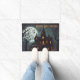 A porta do dia das bruxas apresenta uma casa assombrada à noite com abóboras entalhadas, morcegos e lua de cheio. Personalize com seu texto!