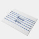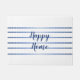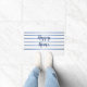 O tapete de porta apresenta faixas azuis em fundo branco. Personalize o texto com o seu.