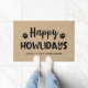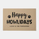 Uma porta de férias festiva e divertida para amantes de animais de estimação apresenta uma redação moderna de "Feliz Howlidays" para o cão. Personalize o texto personalizado com o nome do seu filhote e o sobrenome da sua família. A pata branca imprime o sotaque do estilo manuscrito. Inclui um fundo rústico neutro do que texturizado.