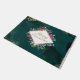Bonita porta de Natal retrata um elegante fundo verde abstrato com salpicos de ouro. Apresenta uma flor vermelha e um design verde ao redor de uma moldura de diamante com a saudação "Feliz Natal" em guião dourado.