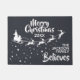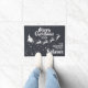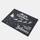 Mostre o quanto você acredita na magia do Natal e do Papai Noel com esta porta de Natal de cinza escura apresentando a silhueta de Papais noeis em branco com suas renas, voando em uma trilha de estrelas. A legenda no topo lê Feliz Natal em letras brancas manuscritas. O texto é facilmente personalizável com seus desejos, ano e nome da família ou nome comercial. Esta porta faz a decoração perfeita de Natal para a sua casa