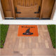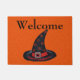 Imagem é um tradicional chapéu preto de bruxa com estrelas laranja e uma fivela prateada. Feliz Samhain está escrito na borda do chapéu. Bem-vindo está escrito no tapete. Imagem é minha pintura original. Veja minha loja Art by MAR para combinar produtos com este design.