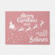 Mostre o quanto você acredita na magia do Natal e Papai Noel com esta porta de Natal mostrando a silhueta de Papais noeis de trenó em branco com suas renas, voando em uma trilha de estrelas. A legenda no topo lê Feliz Natal em letras brancas manuscritas. O texto é facilmente personalizável com seus desejos, ano e nome da família ou nome comercial. Esta porta faz a decoração perfeita de Natal para a sua casa