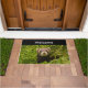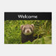 Bem-vinda à porta com uma fotografia adorável com um pequeno furão marrom em pé em um capim longo. Que bom!