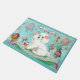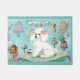 Bonito poodle branco com bolos ricos e frou frou. Doce para um quarto de meninas. O fundo é aqua e há muitos pastos coloridos. Ela está sentada em uma almofada e um pássaro rico está a observá-la.