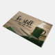 Uma porta de Escritura Inspirativa retrata uma cena pacífica de uma Bíblia aberta sentada ao lado de uma xícara de bebida quente cozida, talvez café ou chá, em uma grade, olhando a água. Apresenta a Bíblia Verse Psalm 46:10, "Fique quieto e saiba que eu sou Deus."-