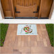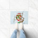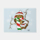 Coruja redonda, giro e giro, toda em vermelho, branco e verde. Flocos de neve caindo ao seu redor.