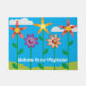 Grandes flores coloridas contra um céu azul brilhante em um estilo divertido de ilustração infantil para o playhouse de crianças.