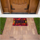 Esta esteira de porta diz a "boa vinda" no rosa quente, nas sombras ou em silhuetas da folha da palmeira das características de design em um por do sol do verão do divertimento.
