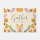 Doce e fofa porta para a temporada de Ação de Graças. O design tem uma raposa no meio com folhagem de outono e flores ao redor. Eles foram pintados com aquarela. No meio há um texto em caligrafia que diz "Junte" com seu nome de família embaixo.