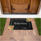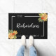Porta de Folhagem de Preto e Branco: Bem-vindos convidados com elegância subestimada usando esta porta personalizada minimalista, com seu nome de família ou uma mensagem personalizada em um roteiro elegante e branco. A personalização é lindamente enquadrada dentro de uma elegante borda branca colocada contra um fundo negro e ousado. Clusters de quedas de aquarela em matizes quentes do outono, como laranja queimado, ouro amarelo e vermelho rico, sobrepõem graciosamente a moldura nos cantos superior direito e inferior esquerdo, acrescentando um toque sutil, mas convidando sazonal. Perfeito por adicionar uma declaração chic, inspirada no outono à sua entrada, esta porta de outono moderna combina linhas limpas e a beleza da natureza, oferecendo um na moda e sofisticadas boas-vindas à sua casa.
