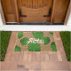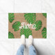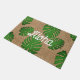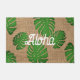 Porta com folhas verdes de Monstera: Aloha Havaiana saudando o design de texto usando fontes casuais de script Ele tem um fundo que se parece com burlap, e o texto é cercado por folhas verdes tropicais pintadas digitalmente. Tem um bom pressentimento de verão. Design por Alma Wad