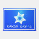 Apresenta uma estrela fractal branca de David em um fundo azul junto com o texto hebraico lendo "B'ruchim Haba'im" (ב ר כ י ה ם ב א ו י ם - bem-vindas).