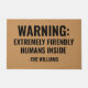 Give your guests fair warning with this hilarious welcome mat! This "design your own door mat" features the bold proclamation: "WARNING: EXTREMELY FRIENDLY HUMANS INSIDE," with a charming, intentional misspelling to add to the humor. It's the perfect way to greet visitors at your front porch and let them know they're entering a fun and welcoming home. Customize it with your family name to make it a truly personal piece. This makes an excellent and unique housewarming gift.
