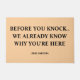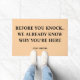 Add a touch of humor to your front porch with this witty welcome mat. Featuring the saying, "Before You Knock... We Already Know Why You're Here," it's the perfect nod to the era of constant package deliveries. This is one of those doormats that gets a laugh from everyone who visits. You can design your own door mat by customizing it with your family name for a personal touch. Made with durable materials, it's a great housewarming gift for friends and family with a good sense of humor.