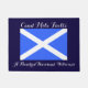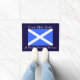 Esteira de porta home bem-vinda para amantes de Scotland e todas as coisas escocesas. No centro do design é um gráfico da bandeira de Scotland, com a cruz branca de St Andrew em um painel azul. Acima do saltire é o cumprimento gaélico escocês tradicional "Ceud Mìle Fàilte" com a tradução inglesa "cem mil boas vindas" debaixo da bandeira, na rotulação de fluxo branca do estilo do convite. Você pode mudar a cor azul escuro do fundo ao terno com o botão da personalização. O doormat seria o presente novo perfeito da casa ou do housewarming para amigos e família com conexões escocesas.