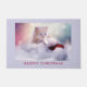 Uma porta com uma fotografia de um gatinho gengibre sentado num chapéu branco e vermelho de Santa. Luzes brilhantes turvas nos fundos. Um trocadilho engraçado. O texto é editável para que você possa mudá-lo, então diga o que quiser.