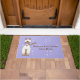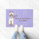 O tapete da porta do amante de gatinho lavanda, com um padrão de pontos branco e rosa. Gráficos de desenho animado de um gato siamês, decoram o lado esquerdo do tapete, com texto marrom personalizado no lado direito. Personalize o texto para ler o que você quer.