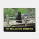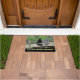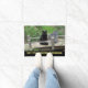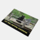 As palavras neste doormat dizem, "pague o pedágio antes de cruzar." Este doormat mostra um gato preto que senta-se ao lado de uma lanterna em uma ponte de madeira rústica cercada por plantas verdes e por flores. Blackie, o gato, faz-lhe sua rotina cada manhã para sair a esta ponte e para passar alguns momentos antes de começar seu dia. Um doormat cómico e bonito para cada amante do gato preto.