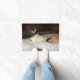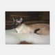 O gato Siamese do ponto do selo que mantem-se morno nas lãs de um cordeiro branco do falso joga a cobertura no sofá. Está colocando tão bonito com sua cauda ondulada e seus olhos azuis impressionantes.