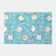 Um tapete de porta com um padrão de gato giro, colocado sobre um fundo azul e decorado com arco-íris e estampas de pata e muito mais.