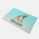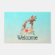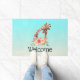 Uma porta de boas-vindas com um desenho fofo em aquarelas de uma mãe e girafa bebê. A girafa-mãe está descansando a cabeça sobre a girafa do bebê, amorosa e adorável. Bonito buquê rosa, amarelo, verde, de flor de aquarela colocado debaixo deste par de queridos. Um fundo gradiente criado com uma delicada mistura de cor azul turquesa numa cor castanho arenoso.