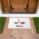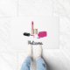 Uma porta de boas-vindas com um design de estilo de vidro. Batom rosa quente e verniz das unhas. A garrafa de esmalte está aberta, deitada do lado, com gotas de esmalte a sair.