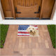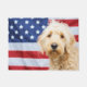 Goldendoodle senta orgulhosamente em frente à bandeira americana no Dia do Memorial.