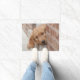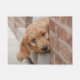 Um adorável Goldendoodle de onze semanas com olhos brilhantes curiosamente sai de uma porta em um muro de tijolos
