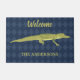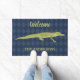 Crie um tapete de boas-vindas que é perfeito para o país do ator. Esta porta tem uma ilustração realista de um crocodilo numa cor verde-oliva, colocada sobre um fundo com padrão azul-marinho, e está pronta para ser personalizada com um nome que corresponda à letra verde-oliva. Você também pode personalizar o título do script no topo.