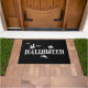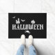 Zwart wit Halloween illustratie met kasteel, pompoen, spin en vleermuizen op een donkere achtergrond.