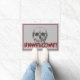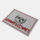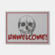 Assusta os convidados indesejados ou divirta-se um pouco com este Halloween com esta porta assustadora. Apresenta um crânio de colheita preto com as palavras "Inbem-vindo" em tipografia glacial vermelha de sangue em um fundo de cinza clara, cercado por uma borda vermelha escura.