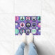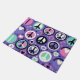A imagem mostra um padrão composto por vários símbolos e formas. Há múltiplos sinais da paz em cores como rosa, preto e branco. Esses sinais estão intercalados com corações e círculos em tons de verde, azul, roxo e rosa. O fundo é roxo com pequenos enfeites como estrelas e pontos em tons mais claros. Esta imagem é interessante devido às suas cores vibrantes e à repetição do símbolo da paz que é comumente associado a movimentos anti-guerra e uma mensagem geral de harmonia.