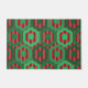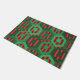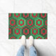 Essa porta tem um design geométrico de hexágonos em quatro tons de verde em um campo de faixas em dois tons de vermelho.