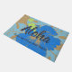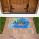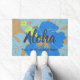 Colorway azul. A mensagem de Aloha dá boas-vindas a seus visitantes a seu próprio paraíso tropical. Esta flor desproporcionado do hibiscus foi inspirada pelo pareaus tradicional vestido para o hula. Monta sobre um pano de grama do falso e vem em diversas maneiras da cor. Você pode personalizar a mensagem.