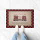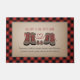 Ilustração de dois pares de botas de caminhada para adultos com estratos vermelhos dispostos em forma de coração com calçados para bebês no meio. Personalize com seu nome. Poem diz, "Porque as mãos pequenas tocam o nosso chão, por favor, deixem os vossos calçados na porta" A base é o estoque de papelão castanho inspirado e a fronteira é a xadrez de búfalo vermelha e preta.