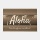 Pista castanha. A mensagem de Aloha dá as boas-vindas aos seus visitantes no seu paraíso tropical. As palmeiras balneares balançantes tocam sobre um fundo de listras gráficas nesse impressão, lembrando os designs usados nas vintage camisas de aloha havaianas e calções de conselho. Este design vem em várias cores. Você pode personalizar a mensagem.