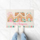 Bem-vindos a toda a vossa casa esta temporada de férias com este adorável tapete de porta de gengibre. Esta design apresenta uma casa festiva de pão Gingerido decorada com rosa, verde e branco. Você pode personalizar este tapete com um nome. Coordena-se com a coleção do Partido Gingerpão.