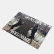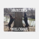 Este tapete de porta mostra uma foto de dois coonhounds preto e bronhounds tratando e diz HUNTERS WELCOME.