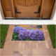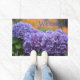 Esta esteira bem-vinda bonita e convidando caracteriza uma capitulação impressionista das flores roxas do hydrangea.