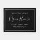 Uma elegante propriedade de casa aberta listando modelo de porta em um clássico de script tradicional e manuscrito em um fundo na moda preto com uma simples borda dupla. Adicione facilmente seu nome e detalhes de contato (telefone, email, mídia social e muito mais). O acessório perfeito para qualquer corretor ou agência de listagem de propriedades!