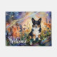 This image features a black-headed tri-colored corgi amidst a vibrant field of flowers. The artwork is rendered in a fluid alcohol ink style, creating a unique visual effect.