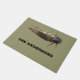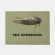 Bem-vindos convidados ou talvez assustá-los com esta porta que mostra uma foto gigante de uma cigarra com olhos vermelhos. Abaixo do inseto há um espaço para adicionar um nome ou outra mensagem em letras negrito. A fotografia e o texto são colocados sobre um fundo de cor verde-oliva.