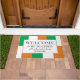 IRISH FLAG Welcome Be Benessed Ireland Doormat with CUSTOMIZABLE TEXT (BEM-VINDO BEM-VINDO BEM-VINDO À Irlanda) com TEXTO PERSONALIZÁVEL. Na moda, patriota WELCOME Doormat com a redação WELCOME & BE BLESSED ALL WHITER ENTER AQUI mais o nome da amostra. O pano de fundo é a bandeira da REPÚBLICA DA IRLANDA num padrão ondulado grande e deslocado. Todo o texto é PERSONALIZÁVEL para que você possa alterar o texto de acordo com suas necessidades, por exemplo, adicionar nome da família, lema da família, citação inspiradora. Esta porta irlandesa de bandeira faria um excelente adicional à sua decoração de varanda para comemorações de Dia de São Patrício.